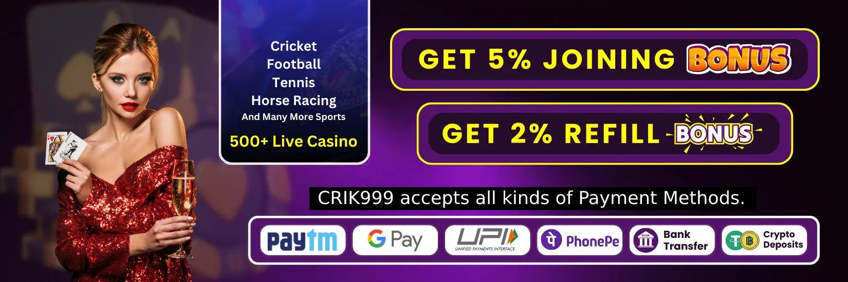 Crik999 offers a range of exciting bonuses including welcome bonuses on your first deposit, referral bonuses, cashback offers, and exclusive promotions during major tournaments like the IPL and World Cup.